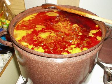 3. Po povaření (asi 30 min) přidáme osmaženou cibulku se vším,co jsme do ní dali a opět asi 20 min. na mírném ohni mícháme. Papriku nakrájenou na pásky přidáme až teď a ještě asi 5 min. děláme.
